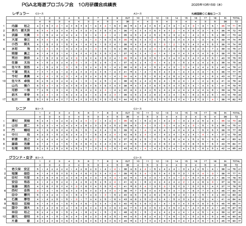 Topics 2025.10.23 2025年 10月研鑽会の成績表をお知らせ致します。 一覧に戻る 最新の5件 2025年 10月研鑽会の成績表をお知らせ致します。 2025年 9月研鑽会の成績表をお知らせ致します。 第6回茨戸オープンの成績表を発表致しました。 第2回阿寒オープンチャレンジゴルフトーナメントの成績表を発表致しました。 シニアレッスン会のお知らせ アーカイブ 2025.10 2025.09 2025.08 2025.07 2025.06 2025.05 2025.04 2025.02 2025.01 2024.11 2024.10 2024.09 2024.08 2024.07 2024.06 2024.05 2024.04