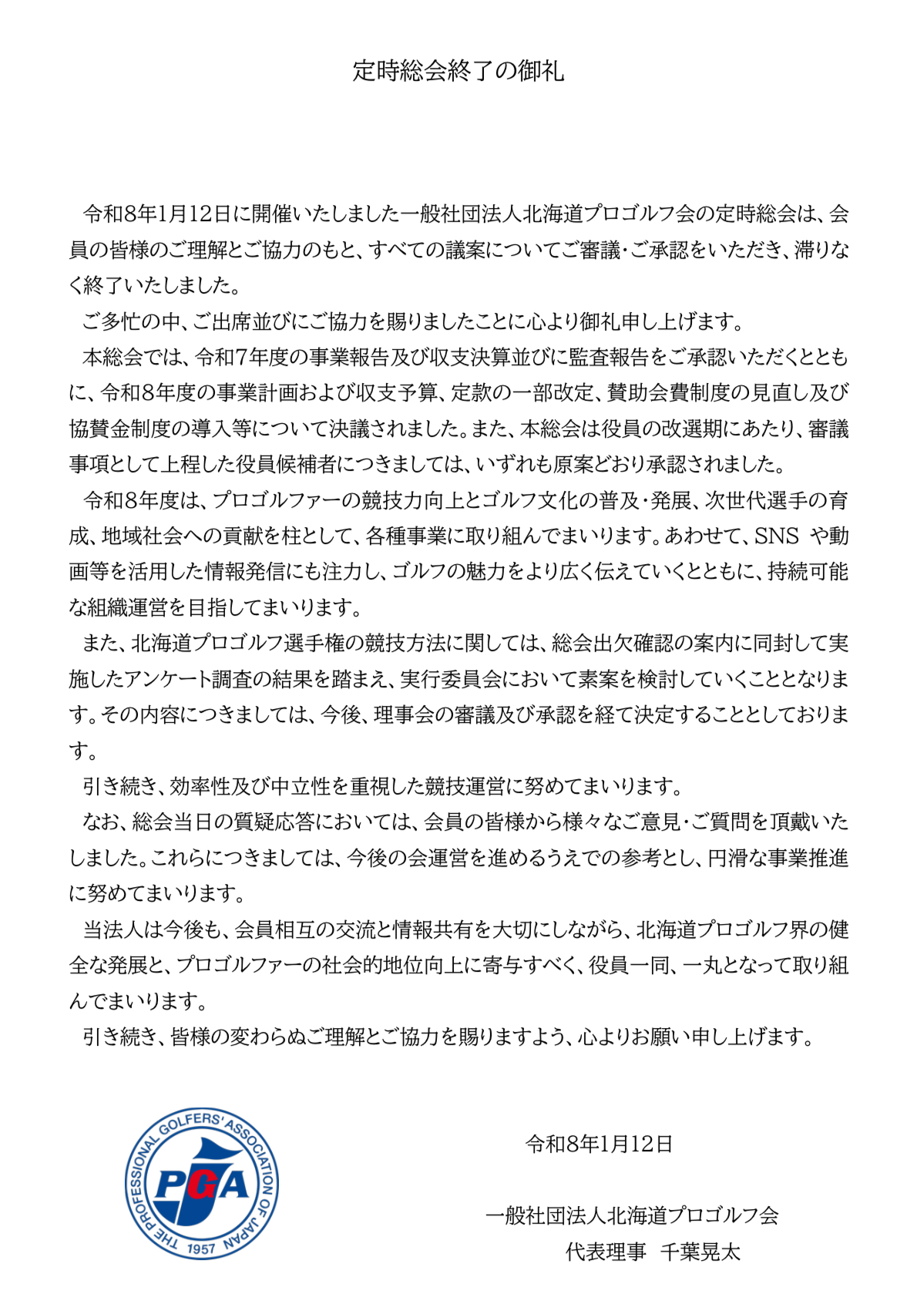 Topics 2026.1.14 定時総会御礼 一覧に戻る 最新の5件 賛助会員について掲載致しました。 定時総会御礼 ジュニアゴルファー応援プロジェクト講習会 2025年 10月研鑽会の成績表をお知らせ致します。 2025年 9月研鑽会の成績表をお知らせ致します。 アーカイブ 2026.01 2025.11 2025.10 2025.09 2025.08 2025.07 2025.06 2025.05 2025.04 2025.02 2025.01 2024.11 2024.10 2024.09 2024.08 2024.07 2024.06 2024.05 2024.04